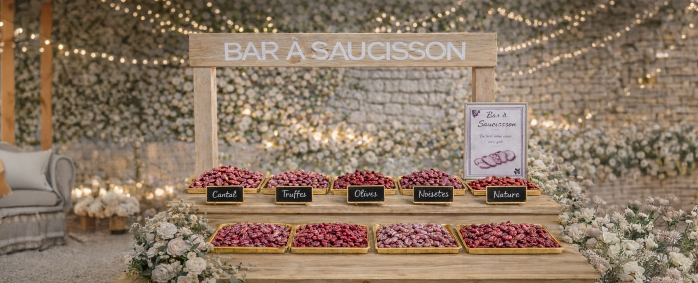 Idéal pour tous vos événements (mariages, baptêmes, anniversaires, fêtes d'entreprise...) et facile à mettre en place, le bar à saucissons est parfait pour créer un moment de partage autour de l’apéritif.